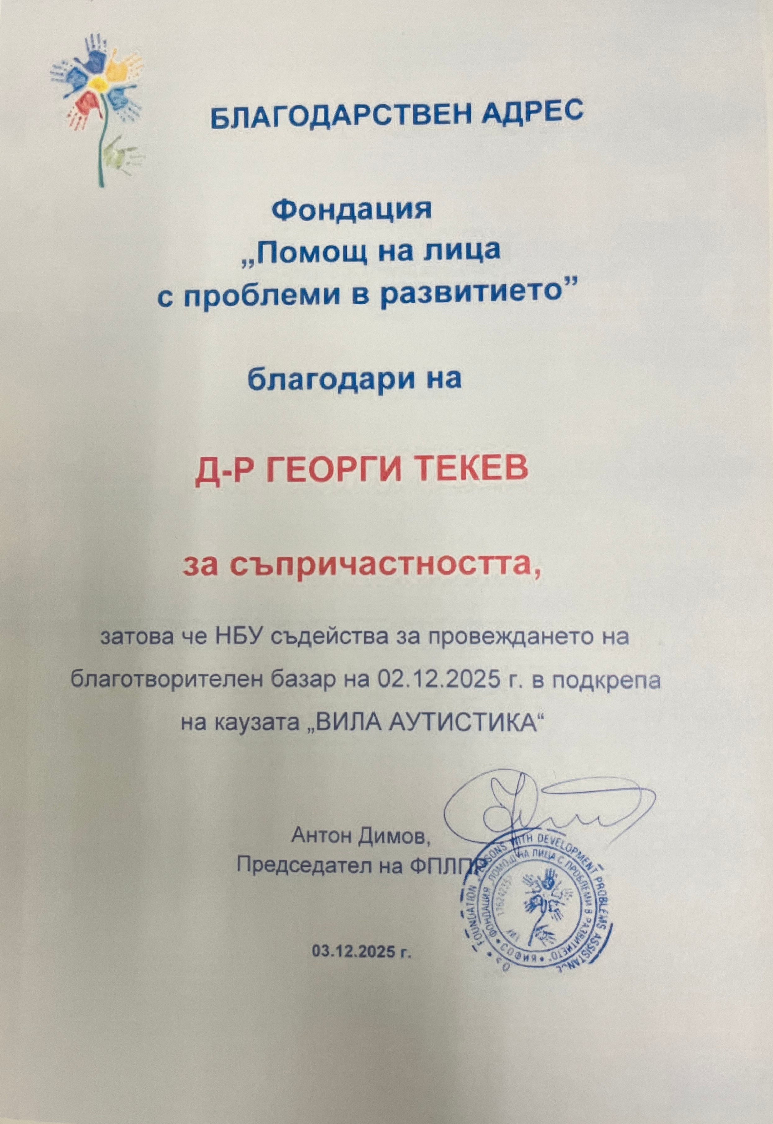 В знак на признателност за дългогодишното сътрудничество и успешната инициатива, Председателят на фондацията, Антон Димов, изпрати официален Благодарствен адрес до Изпълнителния директор на НБУ – д-р Георги Текев. В него се изразява благодарност за съпричастността и за съдействието на университета при реализирането на събитието на 02.12.2025 г. в подкрепа на благородната кауза.
